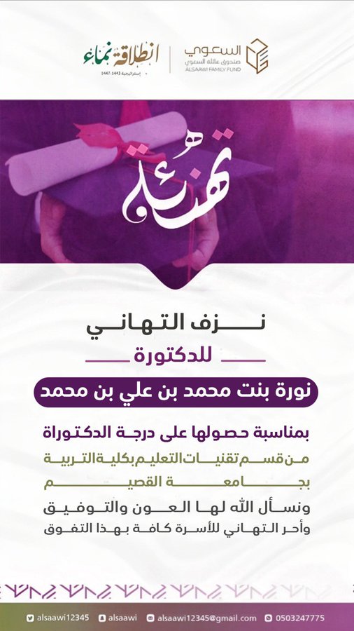 نزف التهاني للدكتورة نورة بنت محمد بن علي بن محمد بمناسبة حصولها على درجة الدكتوراة